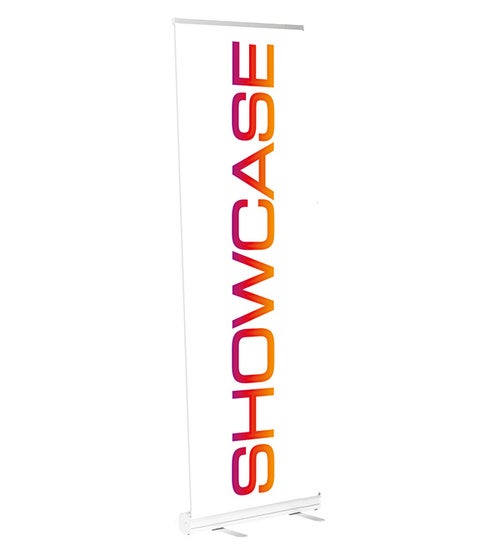 Roll Up i aluminium med två stödben. Tryckt våd med klämlist upp-till som monteras i kassetten med 3M tejp. Levereras i vadderad transportväska. Våden trycks digitalt på rolltex-väv (60% PVC och 40% polyester). Spotlights som tillval. (7604078) Höjd 200 cm.
