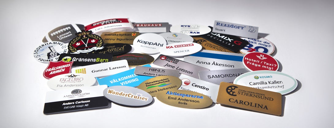 Jobbar du i butik, skall på mässa eller ska representera ditt företag på konferens är sannolikheten stor att du behöver en namnskylt. Vi levererar alla namnskyltar i en snygg och praktisk plastficka som skyddar vid förvaring och gör att brickan håller sig snygg mycket längre. Namnskyltarna levereras som standard med nål, men man kan istället välja magnet eller militärklämma som är snäll mot kläderna. Vi har möjlighet att variabeltrycka stora volymer av namnbrickor och namnskyltar.
