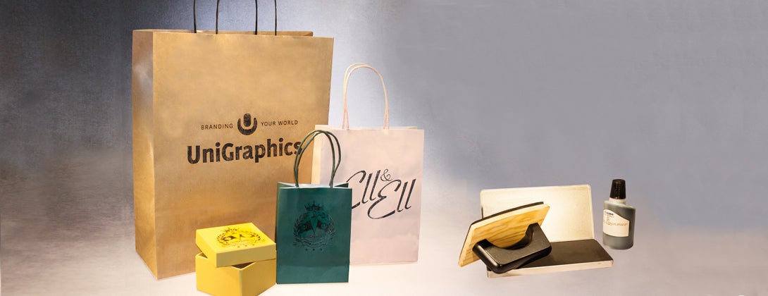 Stämpelkit för pappersbärkassar. Skapa ditt eget personliga avtryck. Kitet innehåller emballagestämpel, dyna och färg.