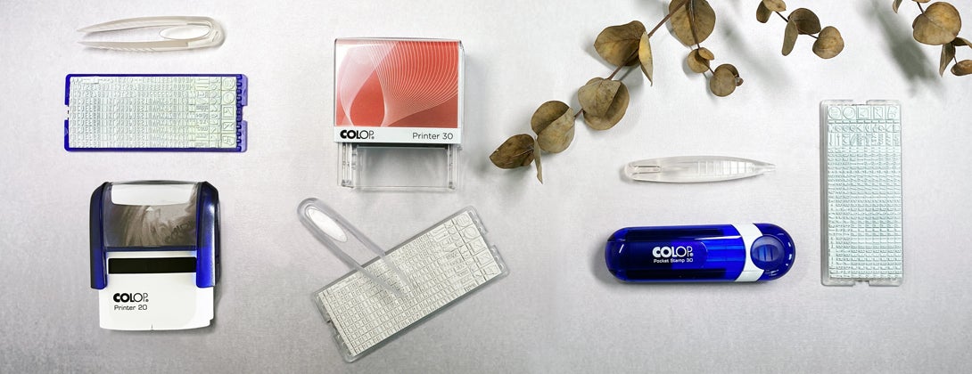Printerstämpel med inbyggd färgdyna där du själv sätter din text. Praktisk och smidig stämpel att ha med sig i väskan/fickan. Pincett medföljer.