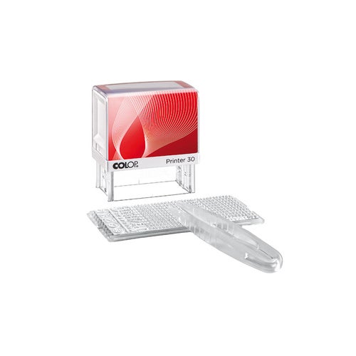 Printerstämpel med inbyggd färgdyna där du själv sätter din text. Typtryckeri med 3,5 mm höga typer och standardsymboler. Pincettt medföljer. Svart dynkassett ingår som standard. Max antal rader 5.