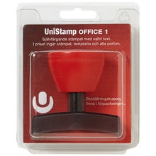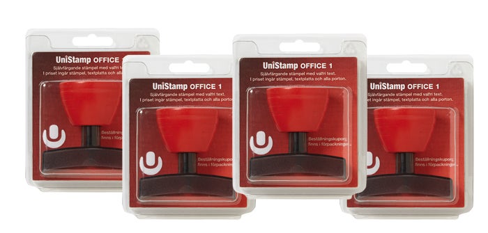 Självfärgande stämpel eller stämpel med inbyggd dyna med. Förpackningen innehåller tillgodokvitto för textplattan. I paketet ingår alltså stämpel, textplatta och alla porton.